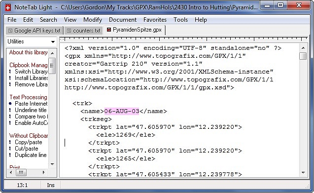 The file being edited was actually called PyramidenSpitze.gpx but will be listed on a Garmin GPS as 06-AUG-03. You can alter this internal name to whatever you wish by using a text editor.