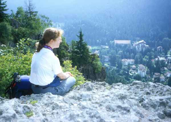 Katharine Bagshaw admiring the Hotel Ciucas in the valley below.