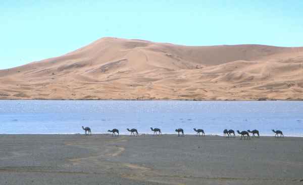 A row of puzzled camels walk past a lake, caused by the heavy rain.