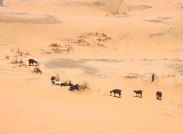 Goats grazing on the few plants that grow on the Erg Chebbi dunes
