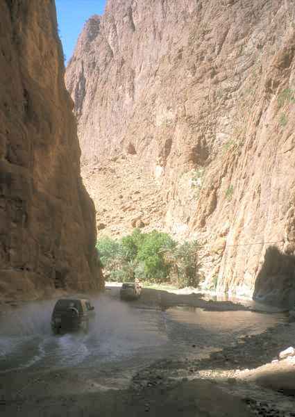 4wd vehicles splash their way through the Todhra Gorge