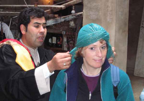 The weavers sold a lot to the New Year group. Here, Alami explains how to fix a head-dress.