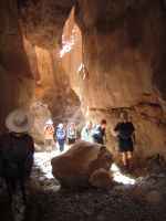 Sunlight and shadow under a huge chockstone.