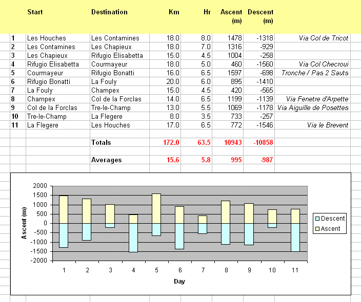 Distances, ascents and descents for Tour du Mont Blanc TMB Values used are from Kev Reynolds guide book