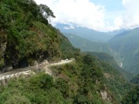 I have put two photos alongside this text. One shows a section of this major road through Bhutan, distinguished only by its nondescript nature (in Bhutan that is!). Look and see how steep the ground is either side of it. The second photo shows a fairly ordinary piece of driving (again by Bhutanese standards!).