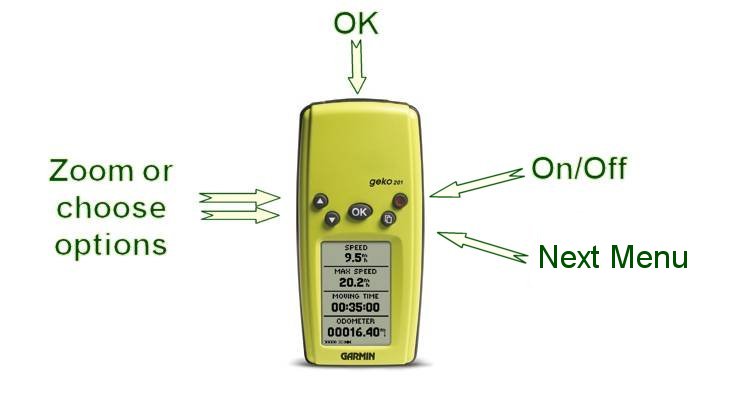 Next have a go at cycling your Geko through its menus by pressing the Lower-Right button repeatedly. 1) Recording and storing a trackRemove previous data before use