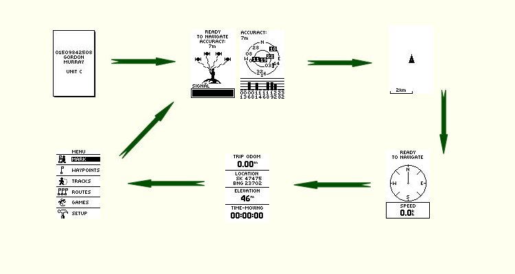 At this point a large arrow should appear on the screen. Start walking and the arrow should begin to point in the direction you should be heading. Just follow its guidance and it should take you around the route you recorded earlier. Try the menu and zoom keys now. The three images above are “Follow arrow” and “Follow track” at two zoom levels. As you walk you may like to try a few presses of the menu key. One of the screens will be a data screen like the one you saw earlier, showing things like the distance covered and the elapsed time. (The contents of this screen can be chosen by the user and may have different content to that shown here.)