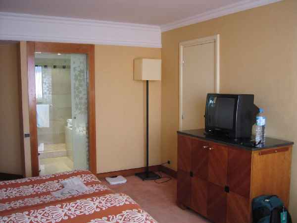 A humble bedroom at the Hyatt. [Neither the simple desk nor the workmanlike pair of phones are visible]
