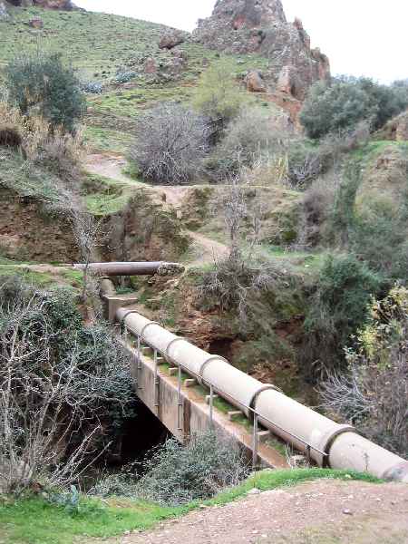 A pipe bridge carries water from one bank to the other and, incidentally, forms a footbridge.