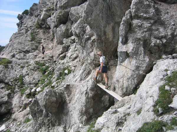 Crossing a gap on a wooden beam. Don't try this one without using the handrail!